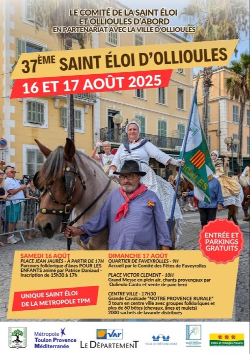 - A 17h30 - Au Centre ville, Grande Cavalcade Animations avec groupes provençaux. Défilé des attelages avec plus de 40 chevaux de traits, comtois, percherons, bretons mais aussi ânes et mulets. Entrée gratuite