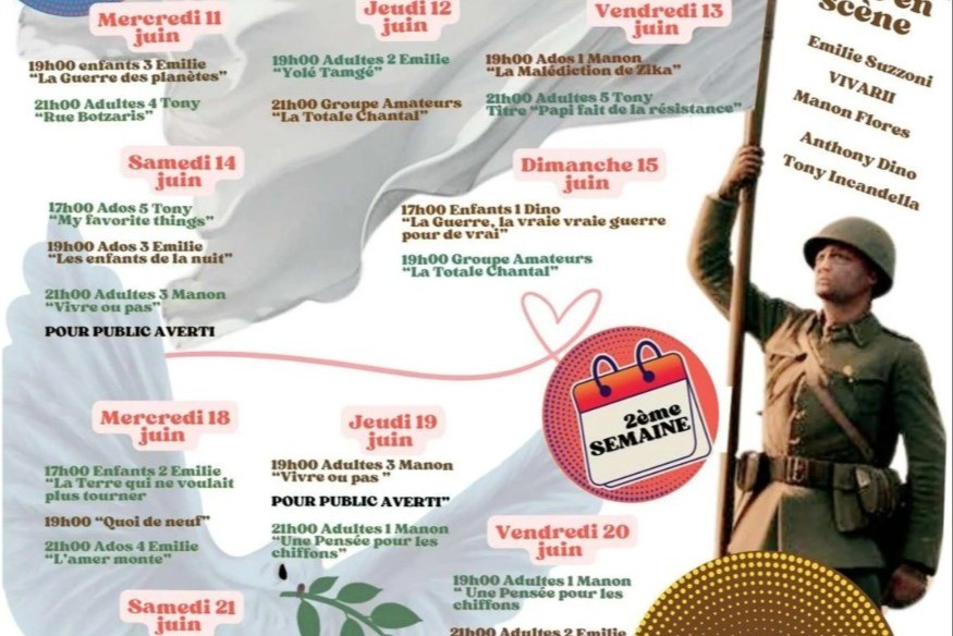> Mercredi 11 juin19h - Enfants 3 Émilie - "La Guerre des planètes"21h - Adultes 4 Tony - "Rue Botzaris"> Jeudi 12 juin19h - Adultes 2 Émilie - "Yolé Tamgé"21h - Groupe Amateurs - "La Totale Chantal "> Vendredi 13 Juin19h - Ados 1 Manon - "La Malédiction de Zika"21h - Adultes 5 Tony - "Papi fait de la résistance"> Samedi 14 juin17h - Ados 5 Tony - "My favorite things"19h - Ados 3 Émilie - "Les enfants de la nuit"21h - Adultes 3 Manon - "Vivre ou pas" (Public averti)> Dimanche 15 juin17h - Enfants 1 Dino -......