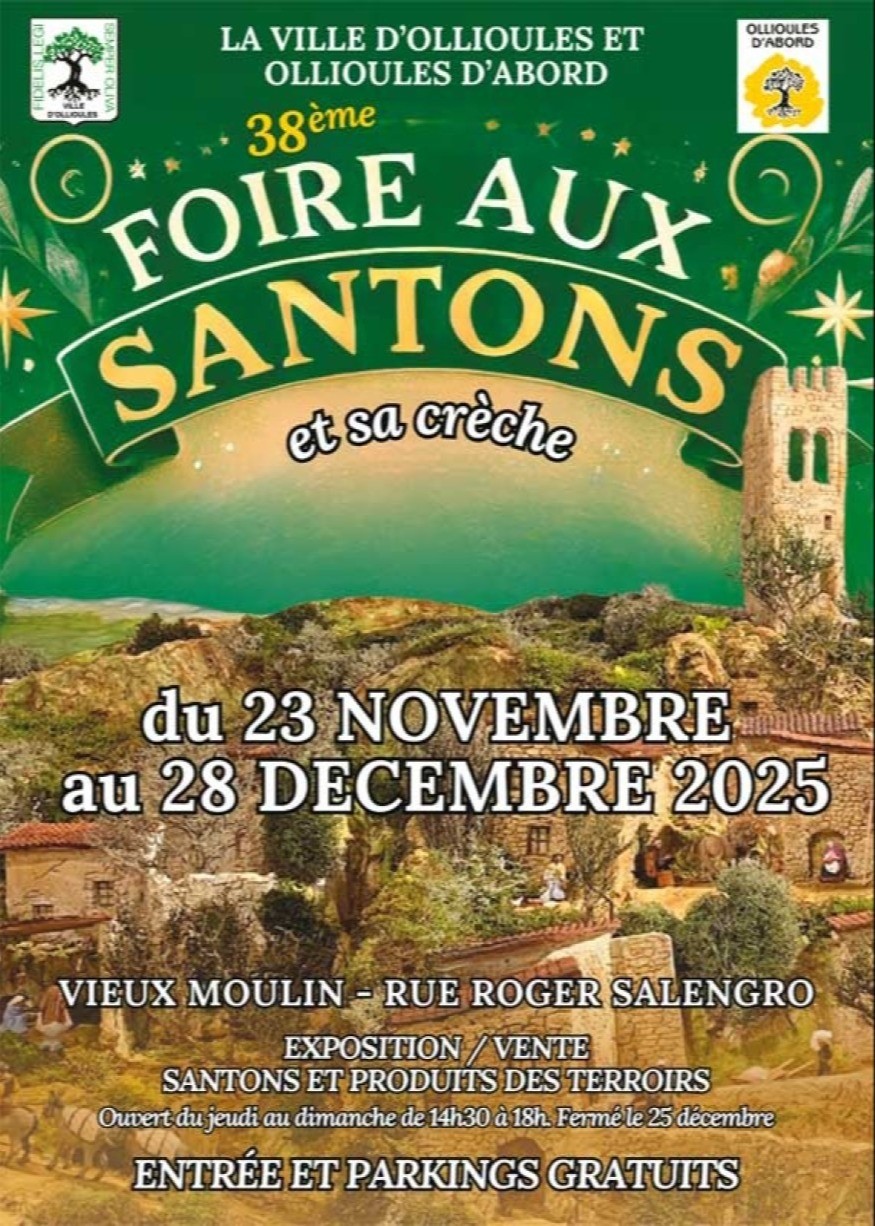 La Foire aux santons et sa grande crèche font leur retour à Ollioules du 23 novembre au 28 décembre 2025. Pour cette 38ᵉ édition, la Ville et l’association Ollioules d’abord vous donnent rendez-vous au Vieux Moulin, rue Roger-Salengro.