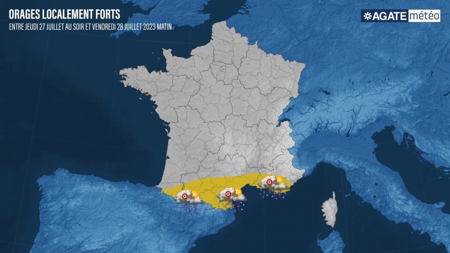 Bref épisode orageux prévu pour jeudi soir et nuit suivante dans des Pyrénées à Provence-Alpes-Côte-d'Azur en passant par l'Occitanie. Risque de grêle, rafales, cumuls 20-40mm, localement des inondations. Restez informés! #AlerteOrages #Météo